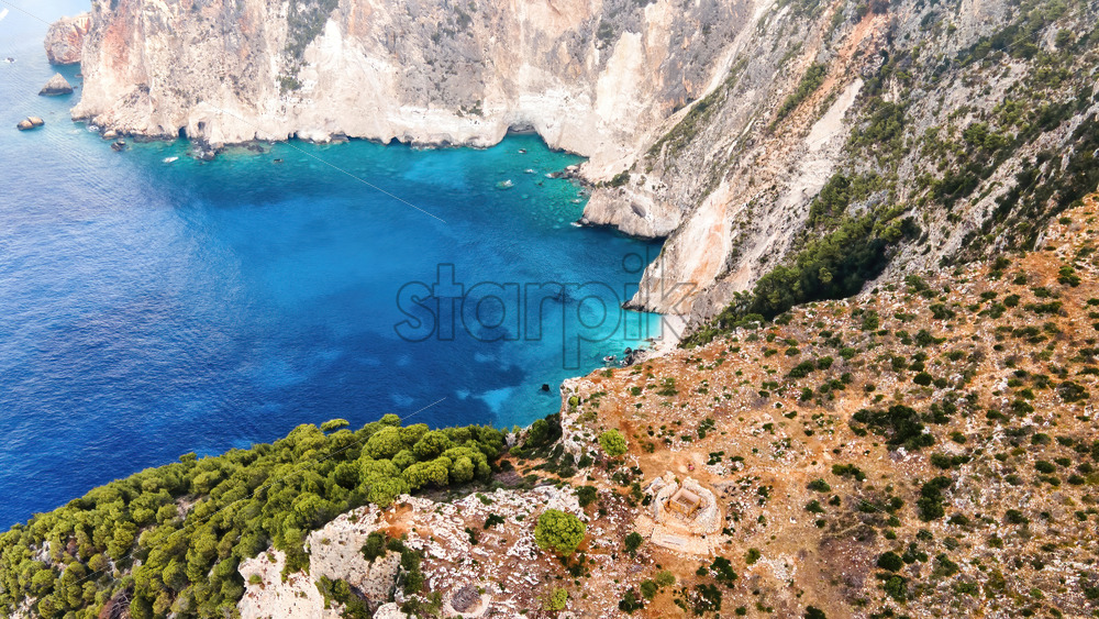 Aerial drone view of the Ionian Sea coast of Zakynthos, Greece. Rocky cliffs, vegetation, blue water