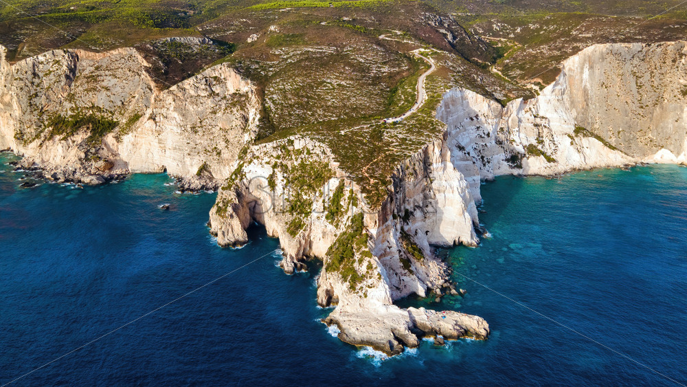 Aerial drone view of the Ionian Sea coast of Zakynthos, Greece. Rocky ridge, sparce vegetation, blue water