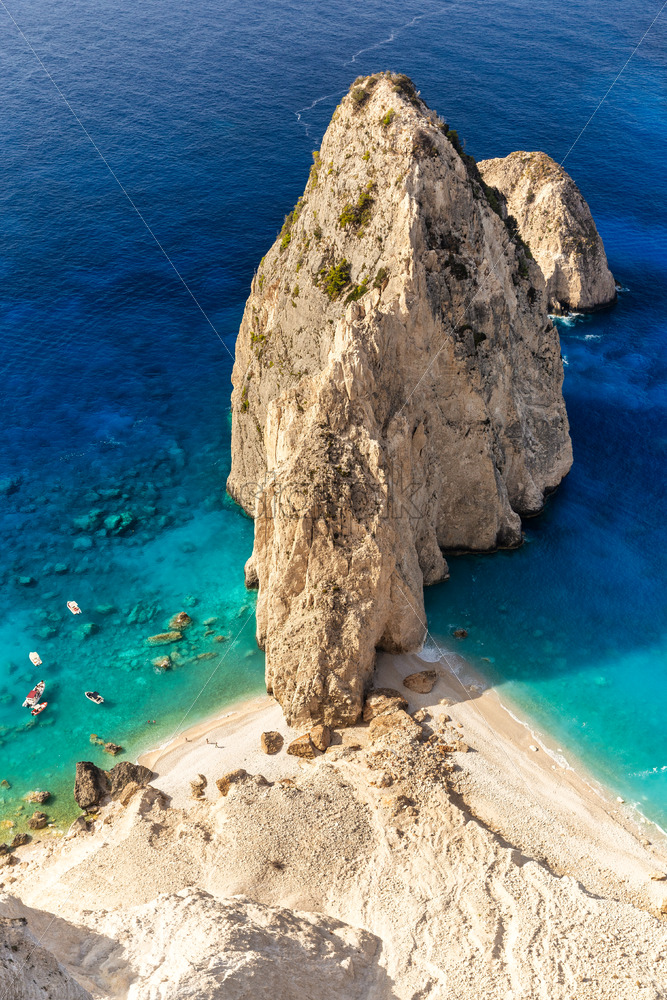 Aerial drone view of the Ionian Sea coast of Zakynthos, Greece. Rocky ridge, beach, moored boats, blue water