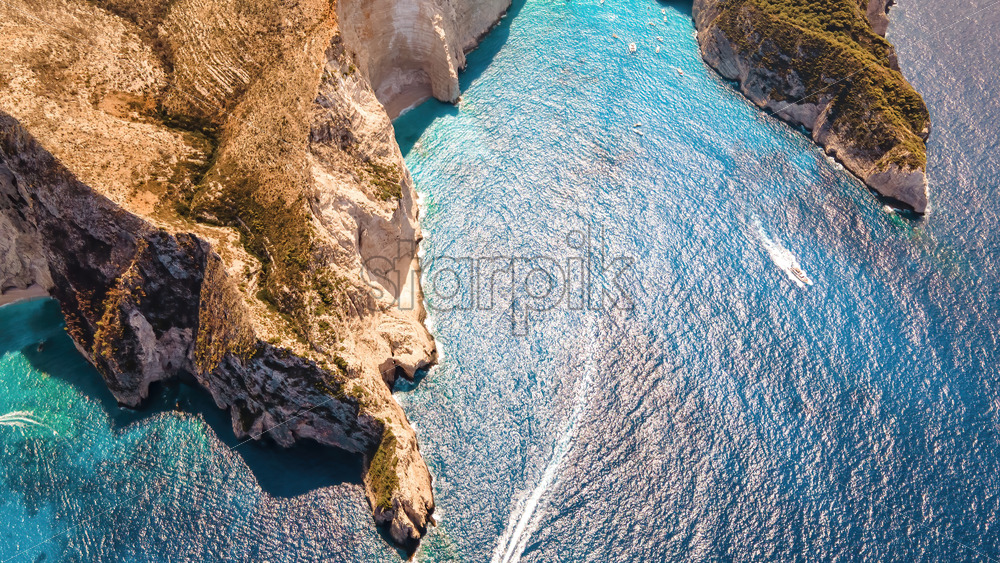 Aerial drone view of the Ionian Sea coast of Zakynthos, Greece. Rocky ridge, floating boats, blue water