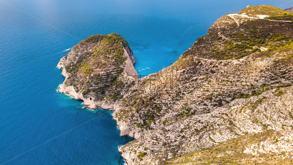 Aerial drone view of the Ionian Sea coast of Zakynthos, Greece. Rocky ridge, sparce vegetation, moored boats, blue water