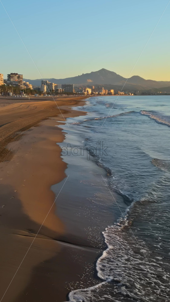 Home » Shop » 1 Video » Video – Aerial drone view of the Mediterranean Sea and the city of Alicante, Spain at sunset. Vertical