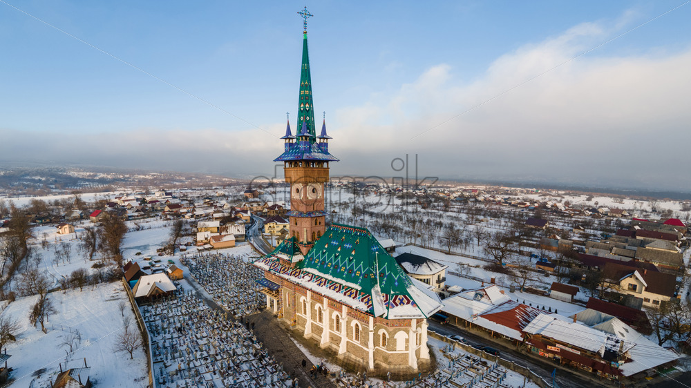 Aerial drone view of The Merry Cemetery in Sapanta in winter, Romania. Multiple tombstones, church, snow