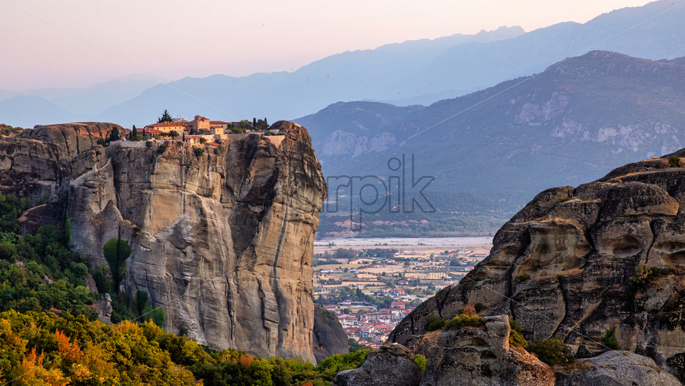 Aerial drone view of the Meteora in Greece at sunset. Rock formations with Orthodox monasteries. A lot of greenery, sacred place