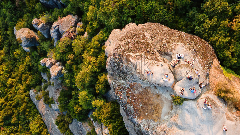 Aerial drone view of the Meteora in Greece at sunset. Rock formations with viewpoint full of people. A lot of greenery, sacred place