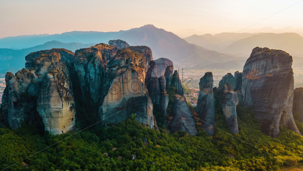 Aerial drone view of the Meteora in Greece at sunset. Rock formations. A lot of greenery, sacred place