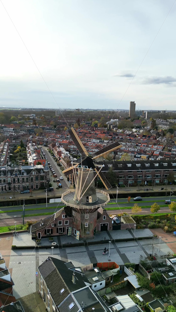 Aerial drone view of the Molen De Roos, historic windmill in Delft, Netherlands. Vertical Royalty Free Stock Video Footage