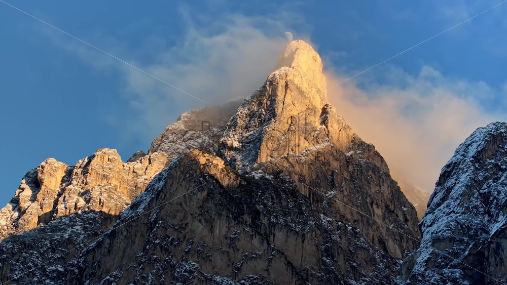 video Aerial drone view of snow on the Sassongher mountain in the Dolomites, Italy with the blue sky on the background