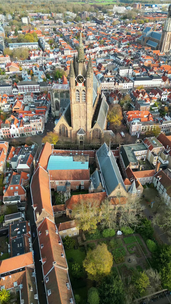 Aerial drone view of the Nieuwe Kerk Protestant church in the city of Delft in the Netherlands. Vertical Royalty Free Stock Video Footage