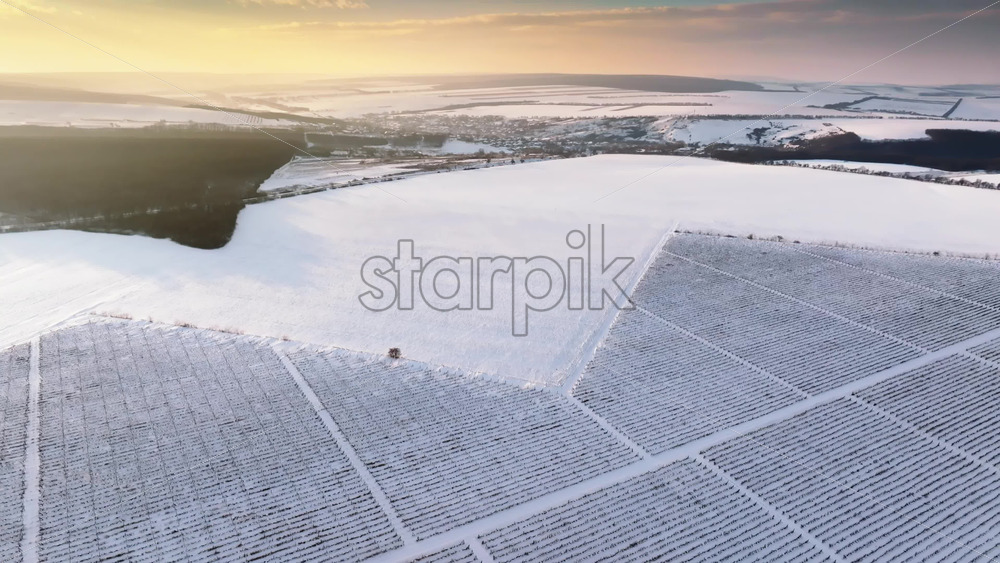 Aerial drone view of Butuceni village covered in snow at sunrise. Fields in Old Orhei during winter in Moldova Royalty Free Stock Video Footage