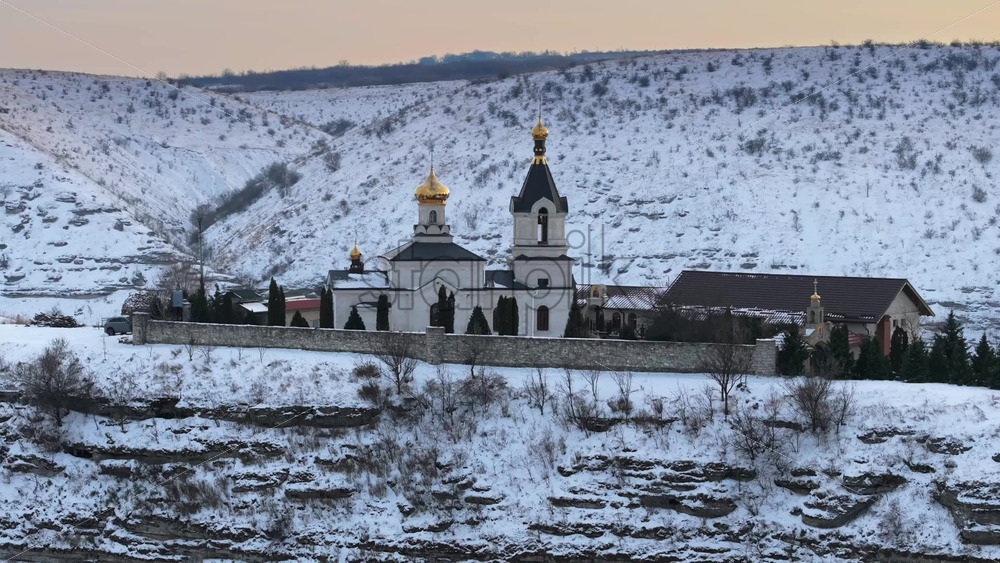 Aerial drone view of the cave monastery in Old Orhei at sunrise. City covered in snow. Moldova Royalty Free Stock Video Footage