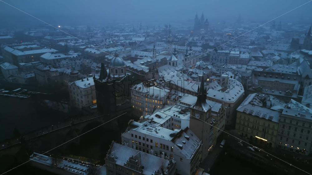 Aerial drone view of Powder Tower and the medieval Charles bridge covered in snow in the night. Winter in Prague, Czech Republic Royalty Free Stock Video Footage