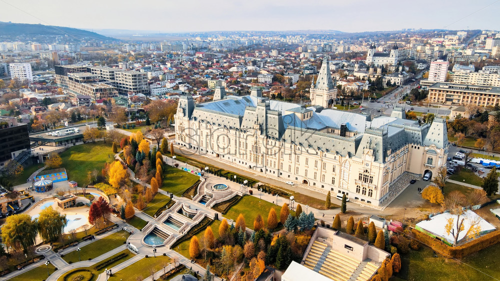 Aerial drone view of the Palace of Culture in downtown. Square in front of it, roads with cars