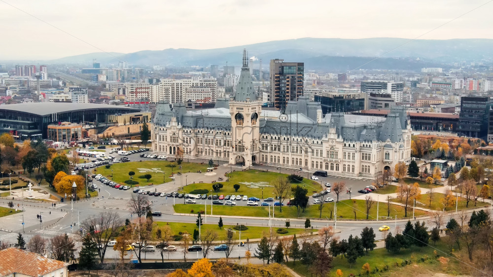 Aerial drone view of the Palace of Culture in downtown. Square in front of it, roads with cars