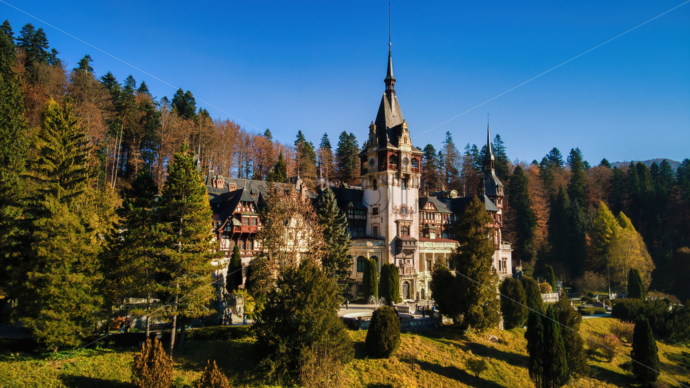 Home » Shop » photo » Aerial drone view of The Peles Castle in Romania. Castle with gardens in Carpathians, forest around it, tourists