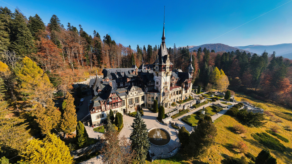 Aerial drone view of The Peles Castle in Romania. Castle with gardens in Carpathians, forest around it, tourists