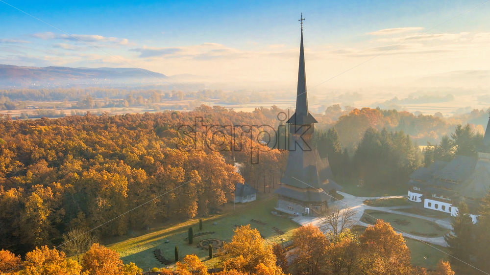 Aerial drone view of the Peri-Sapanta Monastery at sunrise, Romania. Main church and a building, visitors, yellowing forest around