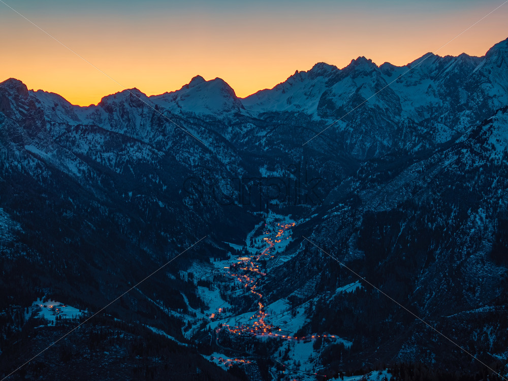Home » Shop » photo » Aerial drone view of the Pescul, human settlement, in Dolomites, Italy, illuminated in the evening