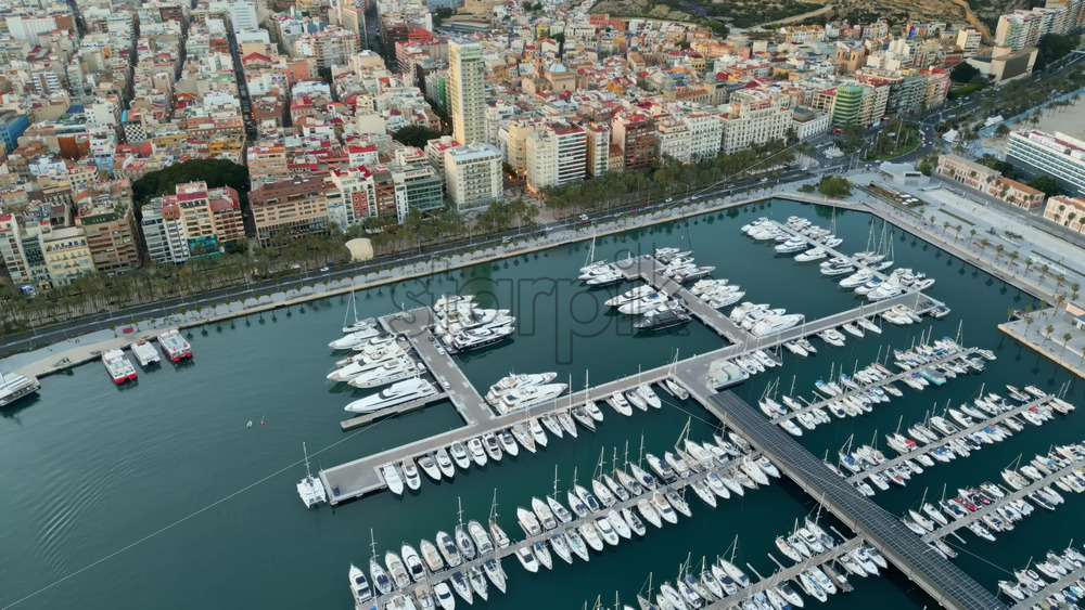 Aerial drone view of the Port of Alicante and the buildings in the city in the evening Royalty Free Stock Video Footage