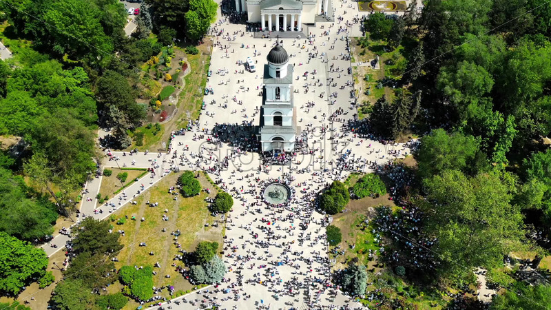 Aerial drone view of the rally in support of the country’s European integration in Chisinau, Moldova. Thousands of people in the city downtown, greenery, EU and national Royalty Free Stock Video Footage