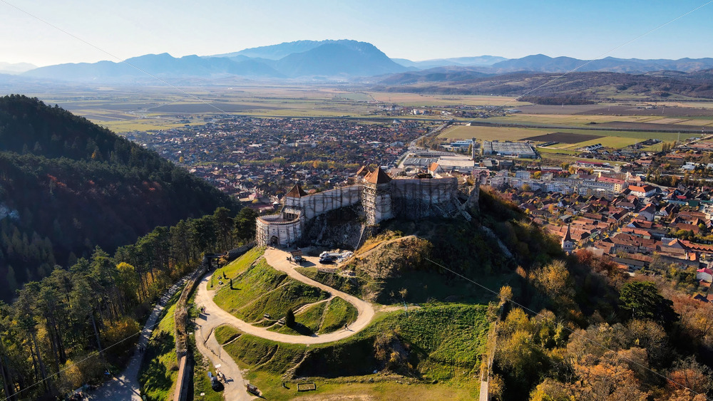 Aerial drone view of The Rasnov Fortress in Romania. Medieval fortress on the top of the hill, town near it