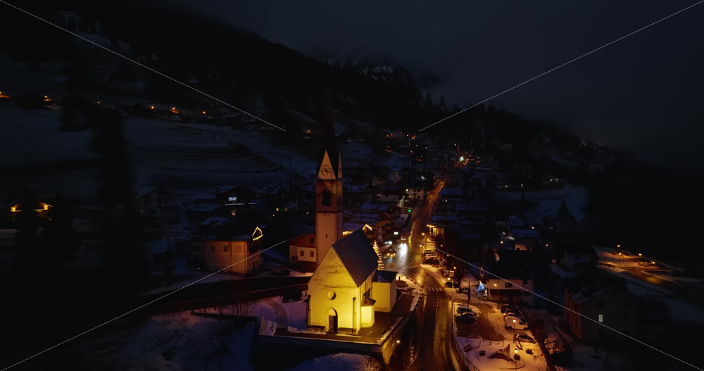 Aerial drone view of the San Lorenzo Church illuminated at night in the Selva di Cadore comune in Dolomites, Italy Royalty Free Stock Video Footage