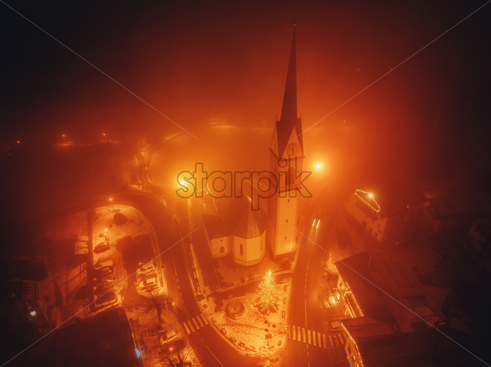 Aerial drone view of the San Lorenzo Church illuminated at night in the Selva di Cadore comune in Dolomites, Italy, snow and fog