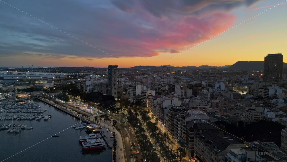 Aerial drone view of the Mediterranean Sea and the Alicante city in Spain at sunset Royalty Free Stock Video Footage