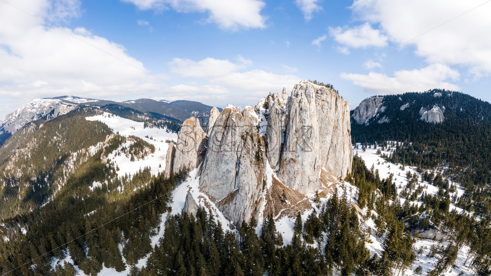 Aerial drone view of the spring Carpathians, Romania. Rocky peaks and valleys partly covered with snow forest