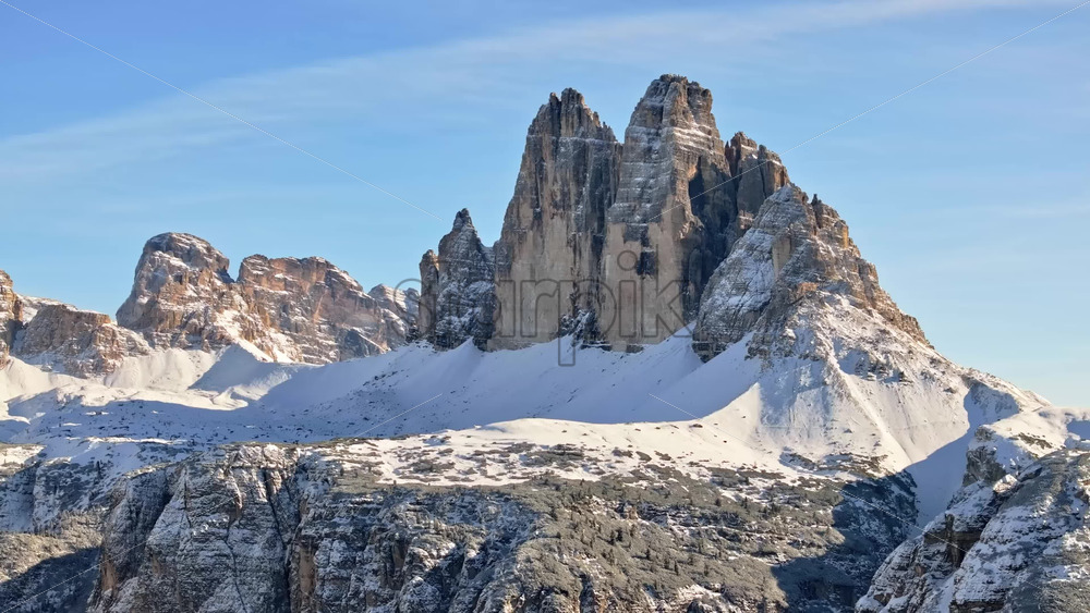 Home » Shop » 1 Video » Video – Aerial drone view of the Tre Cime di Lavaredo in the Sexten Dolomites of northeastern Italy with the blue sky on the background