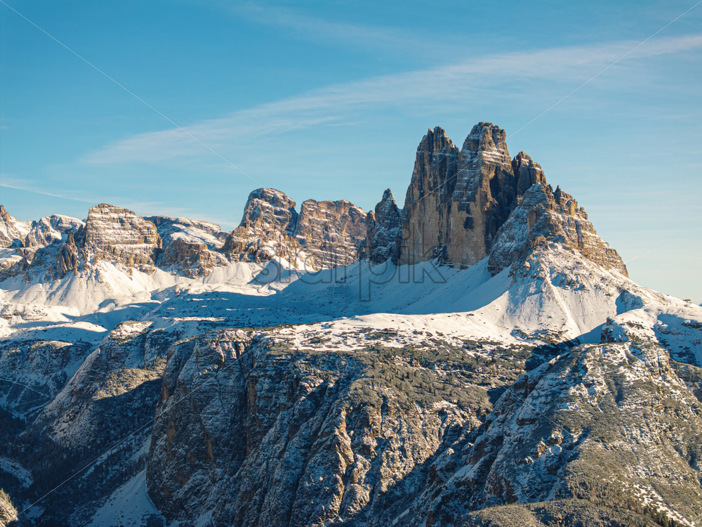 Home » Shop » photo » Aerial drone view of the Tre Cime di Lavaredo in the Sexten Dolomites of northeastern Italy with the blue sky on the background