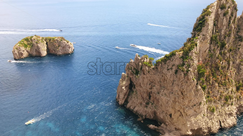 Aerial drone cinematic view of the Tyrrhenian sea coast of Capri, Italy. Rocky cliffs, blue water, floating boats, greenery Royalty Free Stock Video Footage