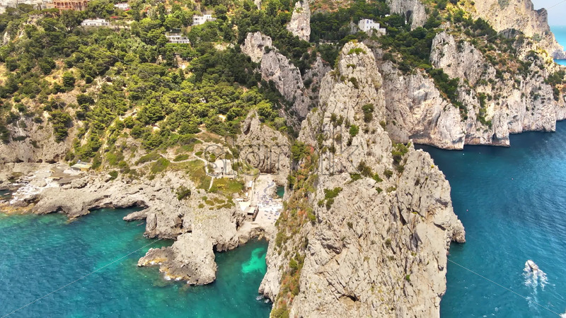 Aerial drone cinematic view of the Tyrrhenian sea coast of Capri, Italy. Rocky cliffs, blue water, floating boats, greenery Royalty Free Stock Video Footage
