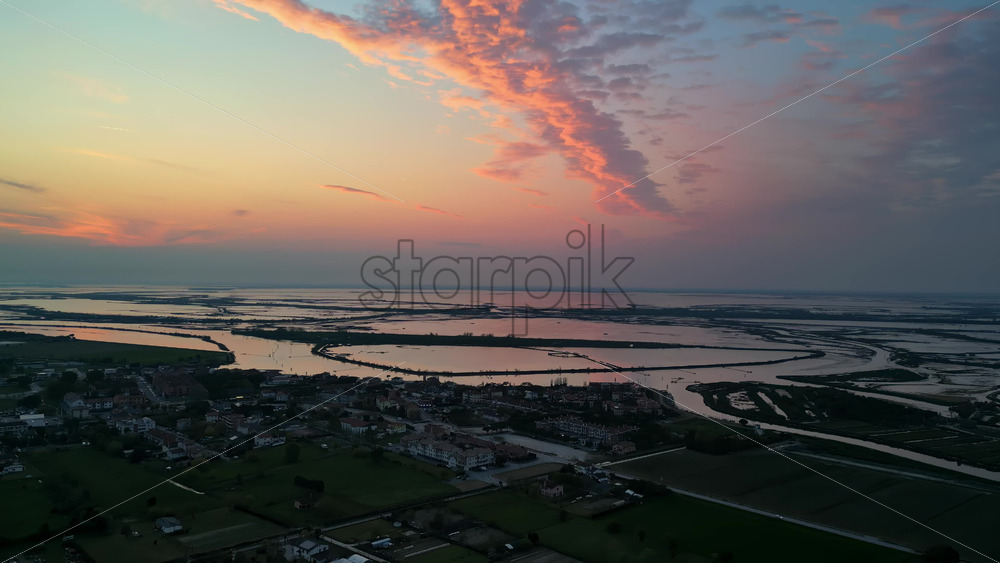 Aerial drone view of the Venetian Lagoon at sunset, near Cavallino-Treporti in northern Italy Royalty Free Stock Video Footage