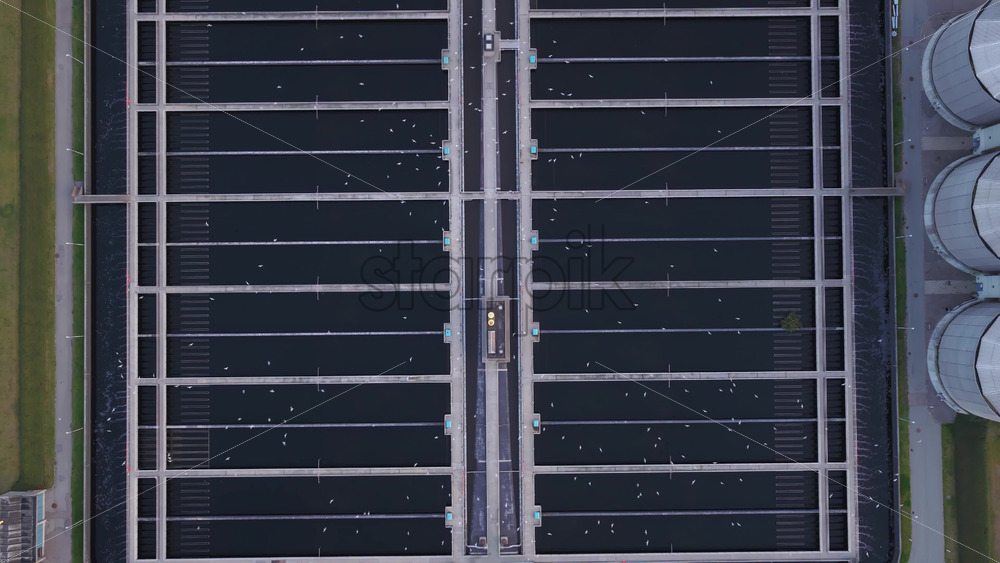 Aerial drone view of the wastewater treatment facility with long water basins and processing structures in Copenhagen, Denmark Royalty Free Stock Video Footage