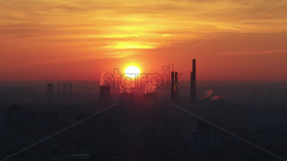 Aerial drone view of thermal power stations in Bucharest at sunset, red sun. Flying birds. Romania Royalty Free Stock Video Footage