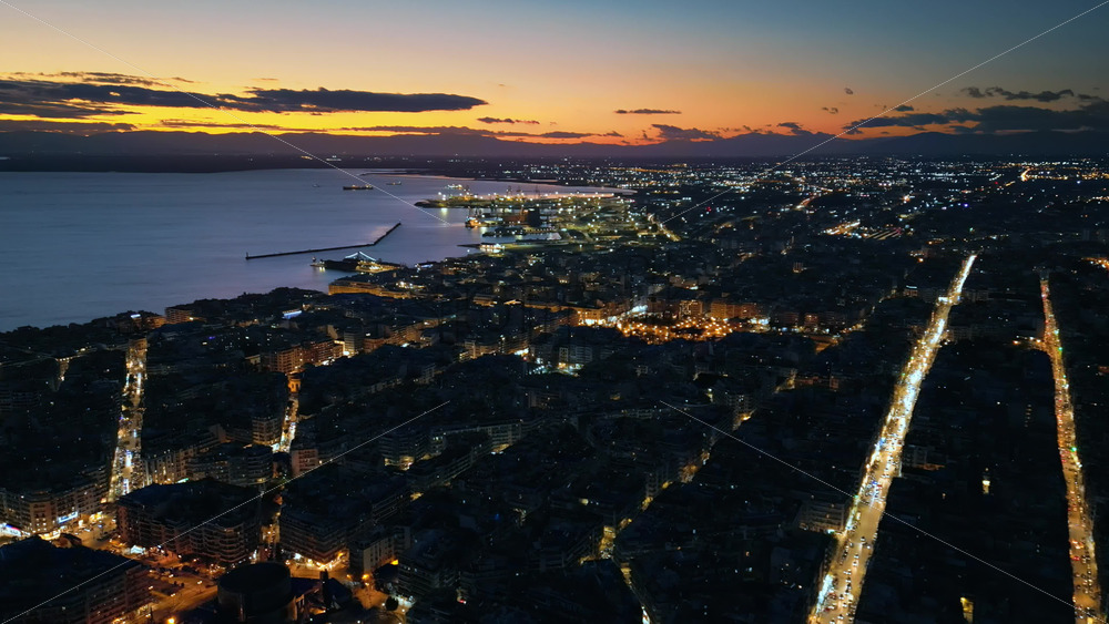 Aerial drone view of Thessaloniki coastline at the sunset. The Aegean Sea in Central Macedonia in Greece Royalty Free Stock Video Footage