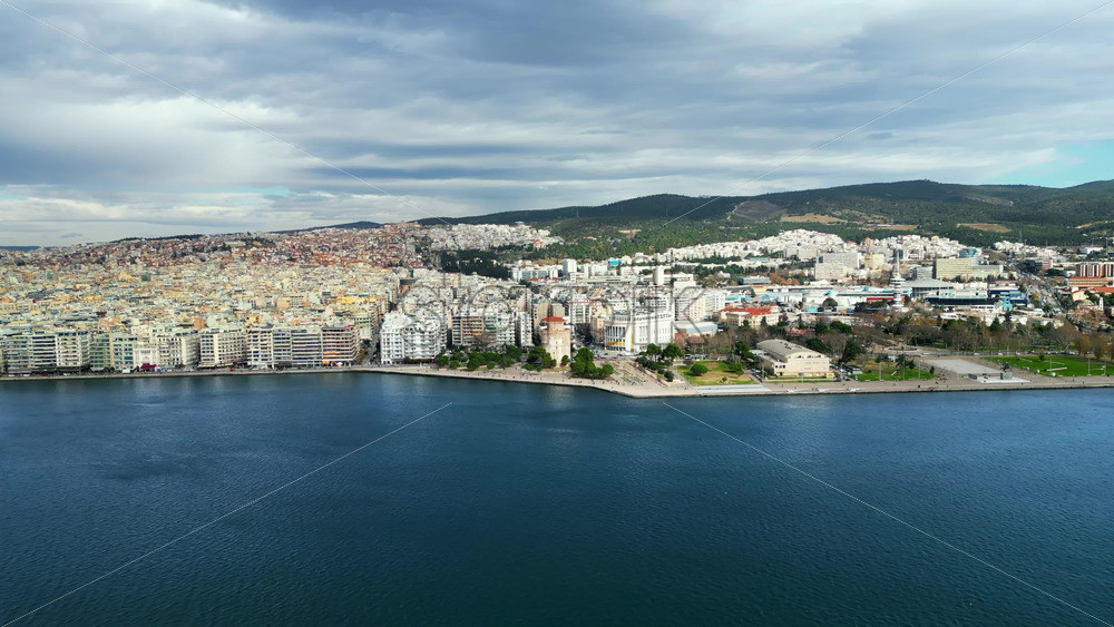 Aerial drone view of Thessaloniki coastline. Monument and museum the White Tower on the waterfront of the city. The Aegean Sea in Central Macedonia in Greece Royalty Free Stock Video Footage