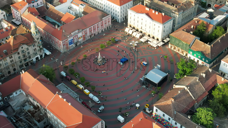 Aerial drone view of Timisoara at sunset, Romania. View of the Victory Square with multiple walking people and historical buildings around Royalty Free Stock Video Footage