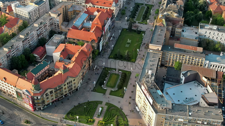 Aerial drone view of Oradea downtown, Romania. State Theatre with square in front of it and historical buildings around Royalty Free Stock Video Footage