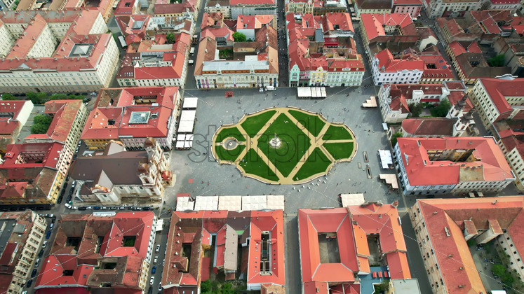 Aerial drone view of Timisoara, Romania. View of the city downtown, Unirii Square with people and multiple historical buildings around Royalty Free Stock Video Footage