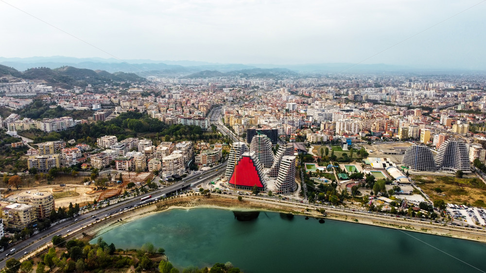 Aerial drone view of Tirana, Albania. City centre with modern buildings, residential district and greenery, lake