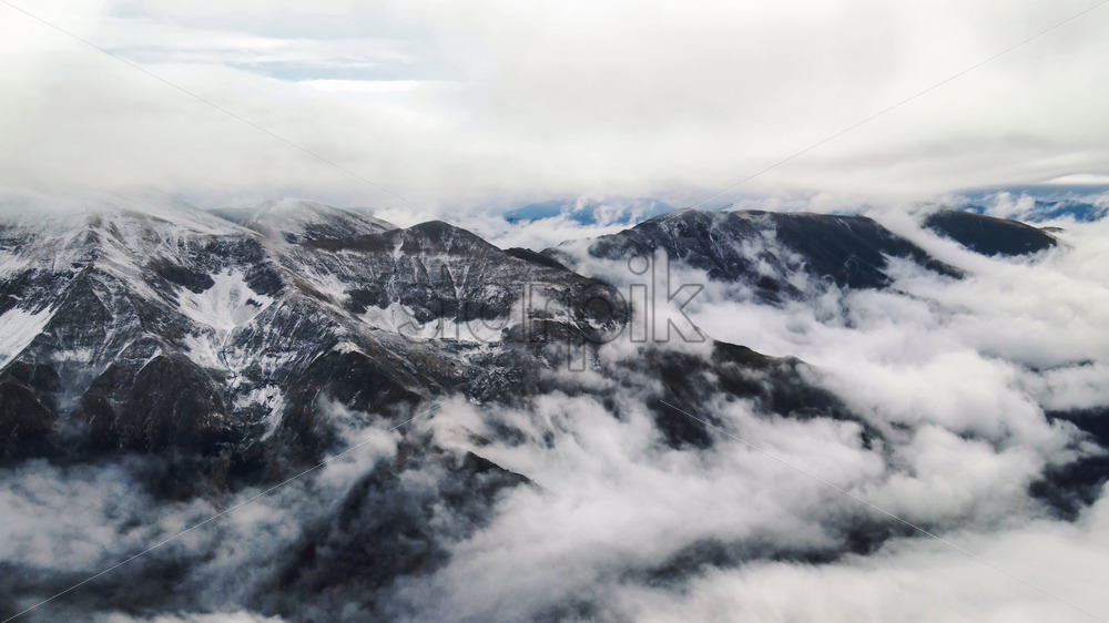 Aerial drone view of nature in Romania. Transfagarasan route in Carpathian mountains, rocky slopes covered with snow, valley and clouds