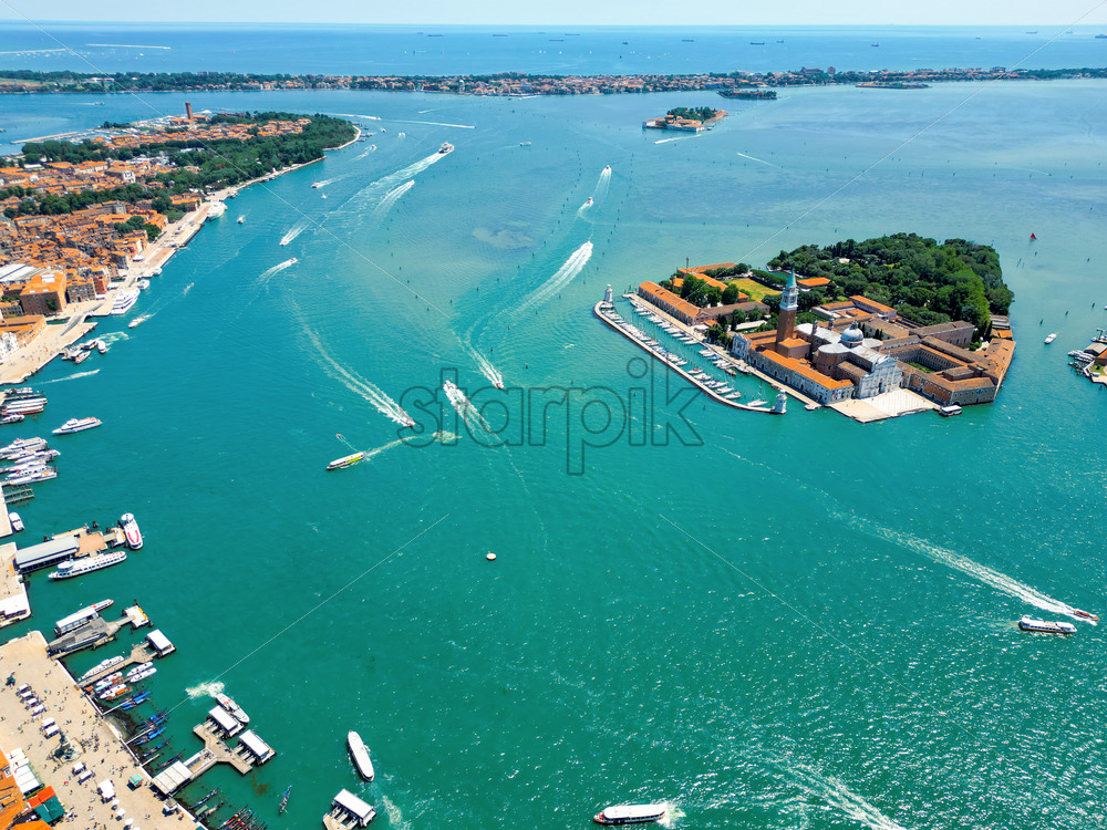 Aerial drone view of Venice, Italy. Water channel with multiple floating and moored boats, San Giorgio Maggiore island