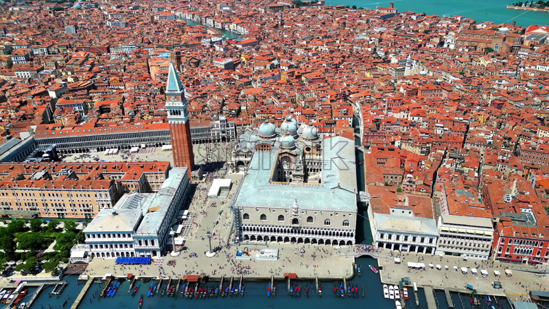 Aerial drone view of Venice, Italy. Water channels with multiple floating and moored boats, historical city centre with St Mark’s Square and other old buildings and narrow streets