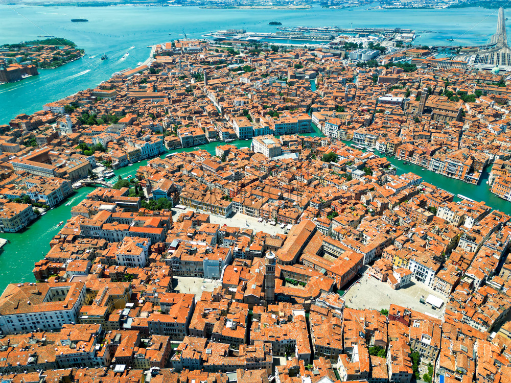 Aerial drone view of Venice, Italy. Water channels, historical city centre with old residential buildings and narrow streets