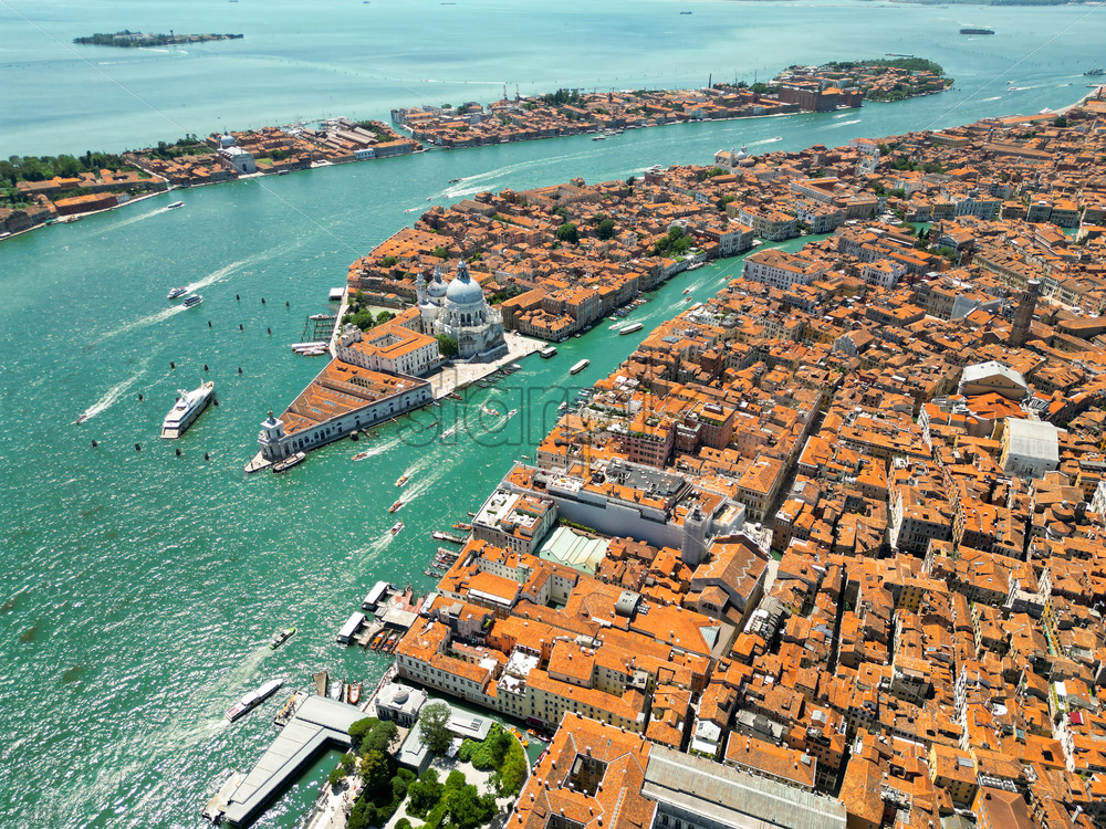 Aerial drone view of Venice, Italy. Water channels with multiple floating and moored boats, historical city centre with Santa Maria della Salute and other old buildings and narrow streets