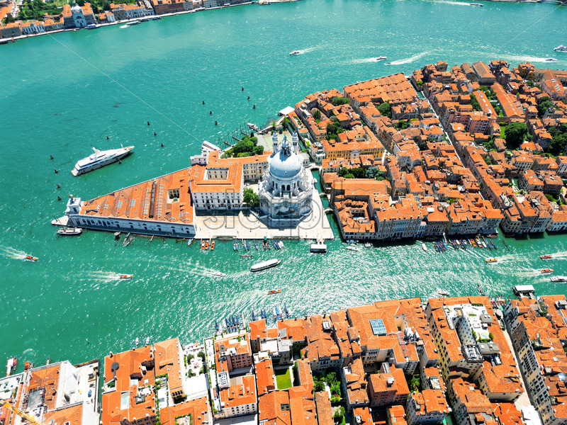 Aerial drone view of Venice, Italy. Water channels with multiple floating and moored boats, historical city centre with Santa Maria della Salute and other old buildings and narrow streets