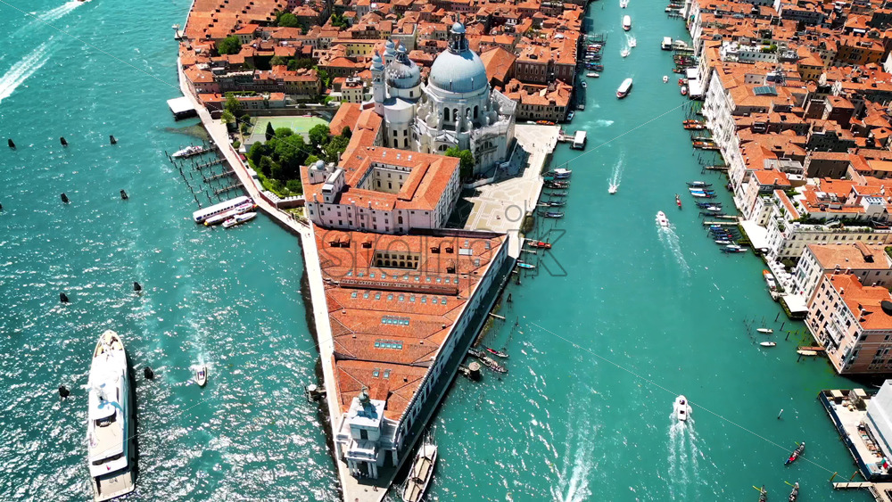 Aerial drone view of Venice, Italy. Water channels with multiple floating and moored boats, historical city centre with Santa Maria della Salute and other old buildings and narrow streets Royalty Free Stock Video Footage