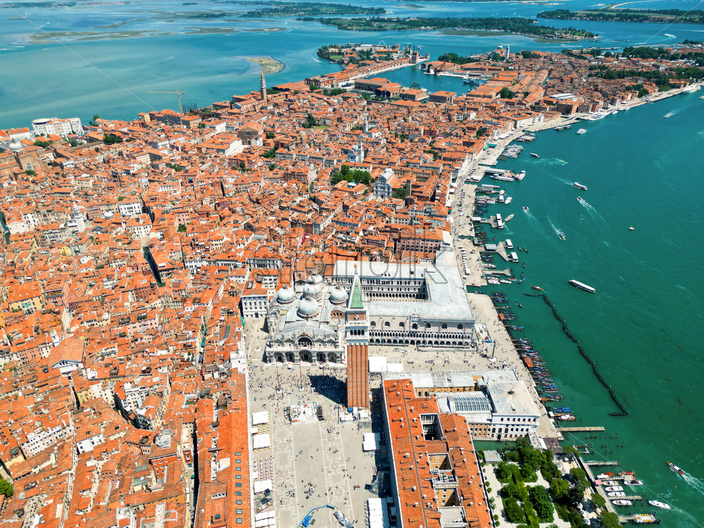 Aerial drone view of Venice, Italy. Historical city centre with St Mark’s Square and other old buildings and narrow streets